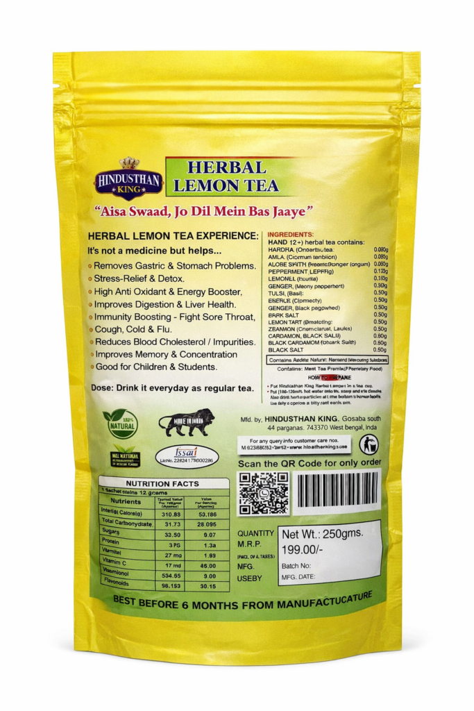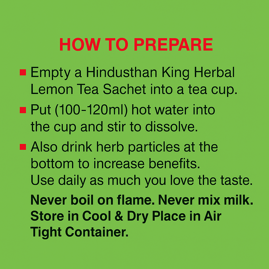 Discover the perfect balance of lemon and powerful herbs in Hindusthan King Herbal Lemon Tea. Made with time-tested Ayurvedic ingredients like Amla, Harad, Baheda, Tulsi, Ginger, and Black Pepper, this tea is not just delicious but also supports your overall well-being.